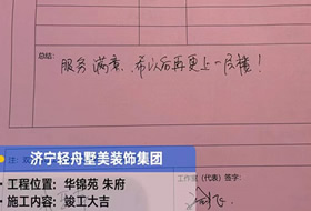 貴府的工程已全部圓滿竣工并通過(guò)了竣工驗(yàn)收,感謝您在整個(gè)過(guò)程中對(duì)于我們的理解、支持和包容。輕舟美住裝飾王洪綱工作室提前恭賀您和家人喬遷新居,恭祝您和家人生活幸福美滿、事業(yè)蒸蒸日上。